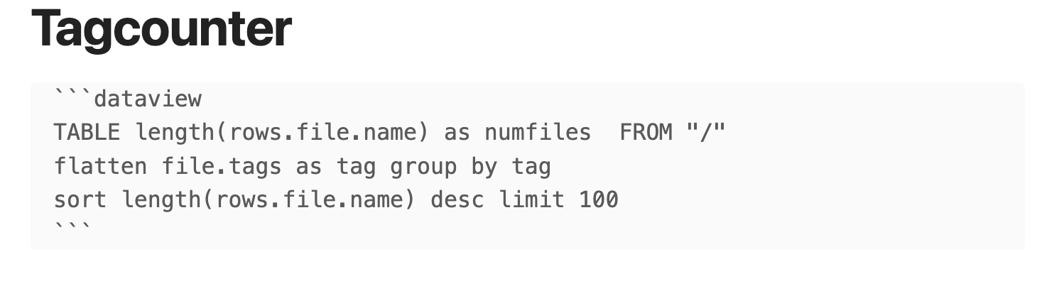 Once each note had been created and tagged a codebook for each of the question or topic areas could be generated using the dataview plugin and the simple query shown below.