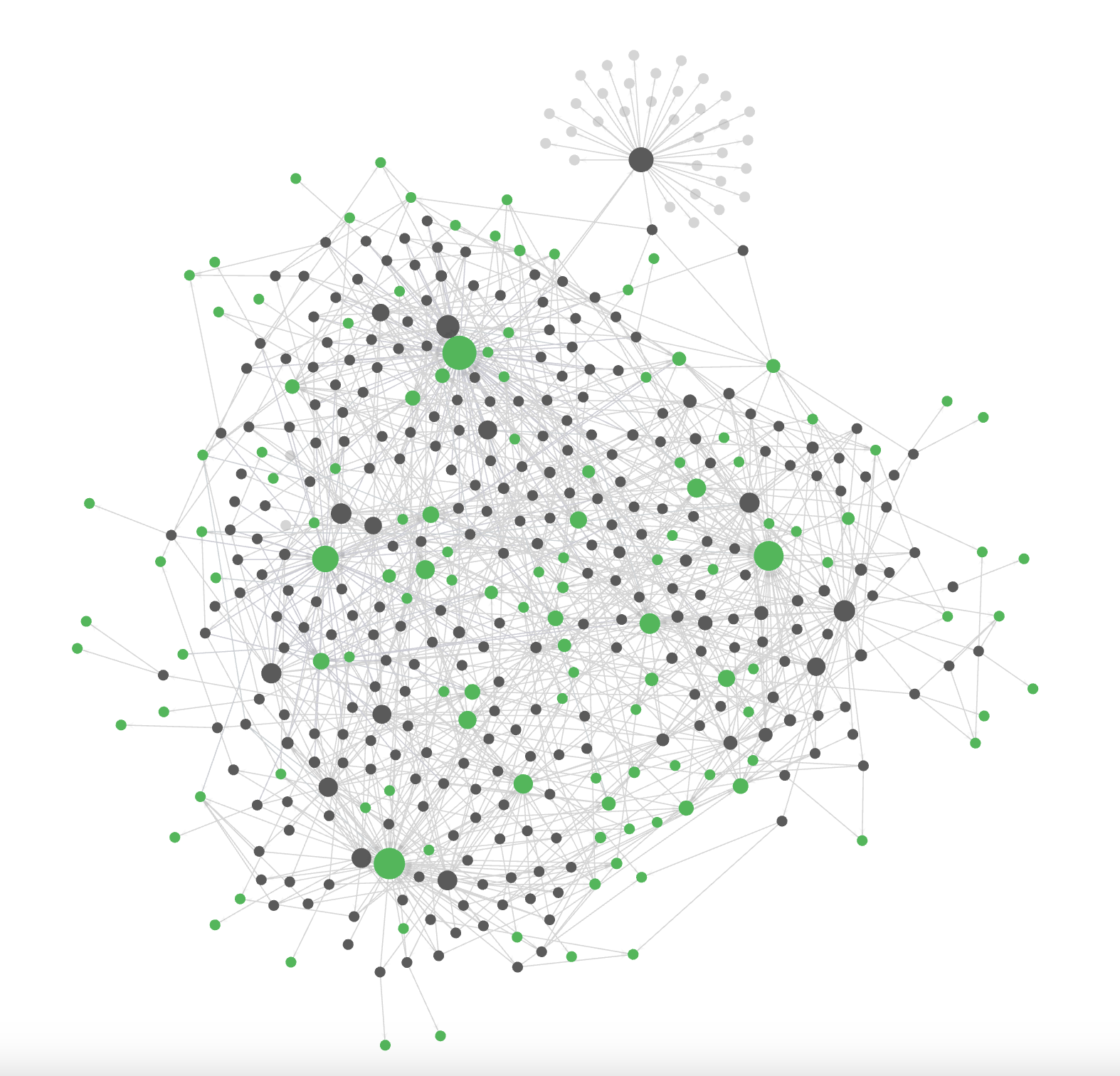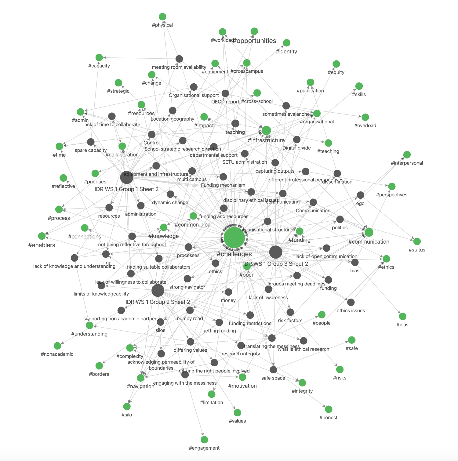 - The Obsidian graph view and dataview queries combine to give various views on the data to support the next steps of thematic coding. Here the codes are shown in green and the notes in grey. Challenges as the unifying element is obviously the strongest but we can also see the predominance of other nodes and the connections formed.