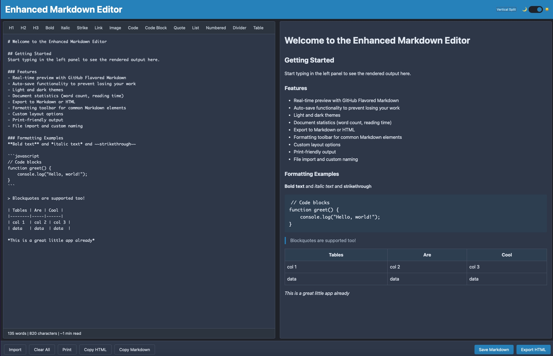 When I set out to create a browser-based Markdown editor, I had a simple goal in mind: build a straightforward split-screen interface that would allow users to write Markdown on one side and see the rendered output on the other. What started as a simple concept evolved into a fully-featured application – and all within a single HTML file with no external dependencies (aside from the Markdown parser library).
